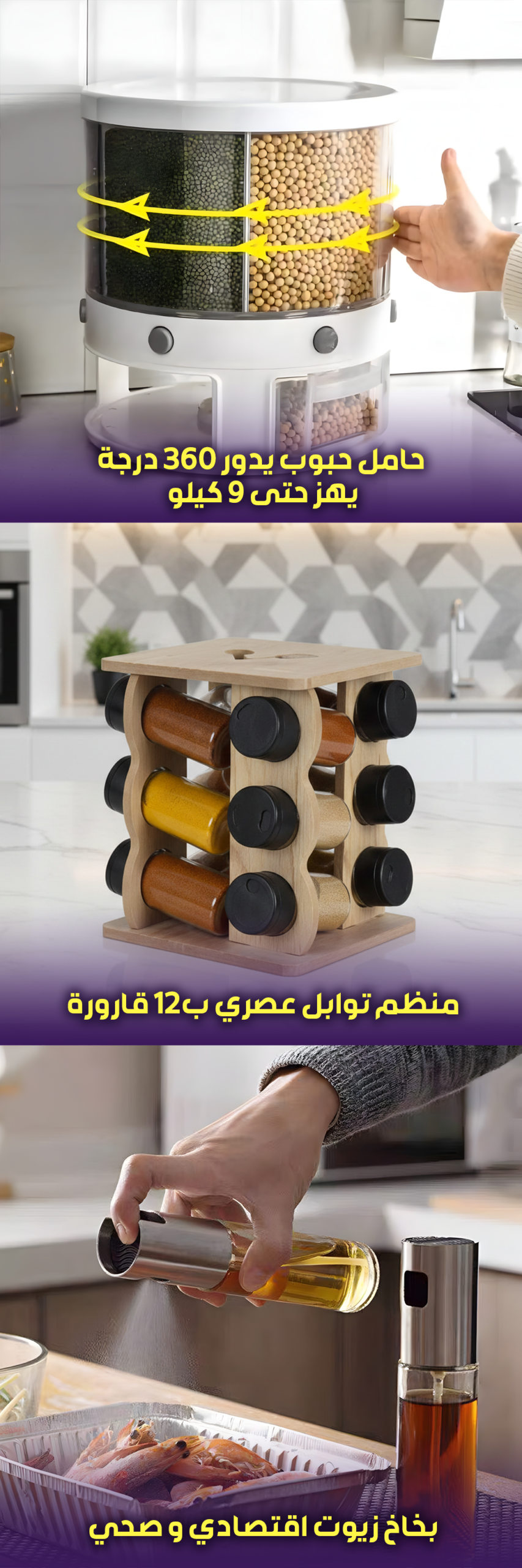 | حزمة تنظيم المطبخ حامل حبوب يدور 360 درجة +منظم التوابل+رشاشة الزيت | 1 2900 د.ج |